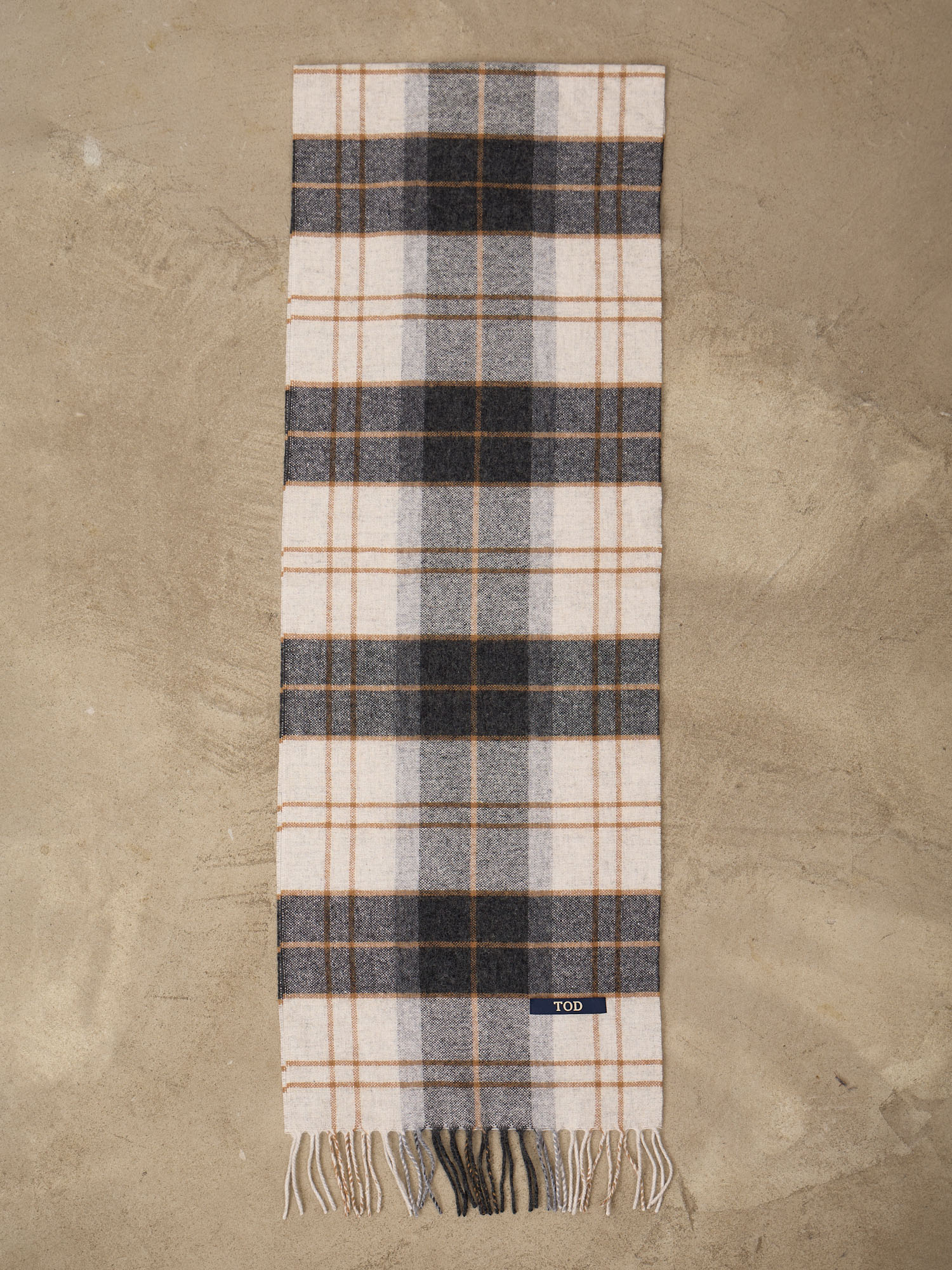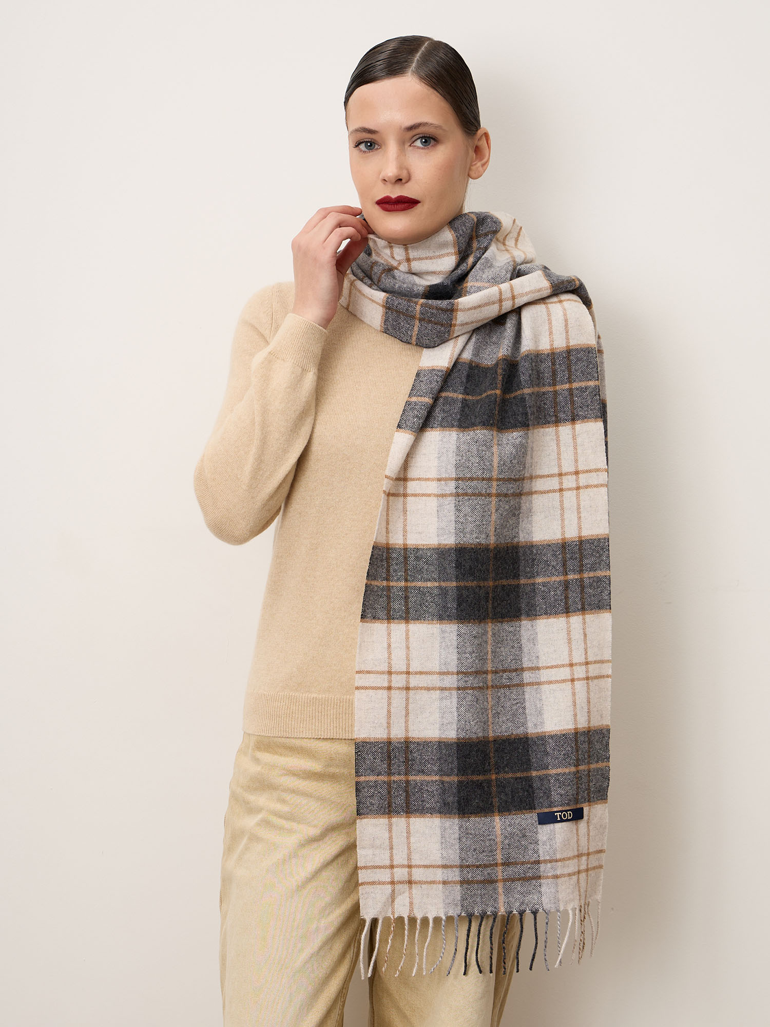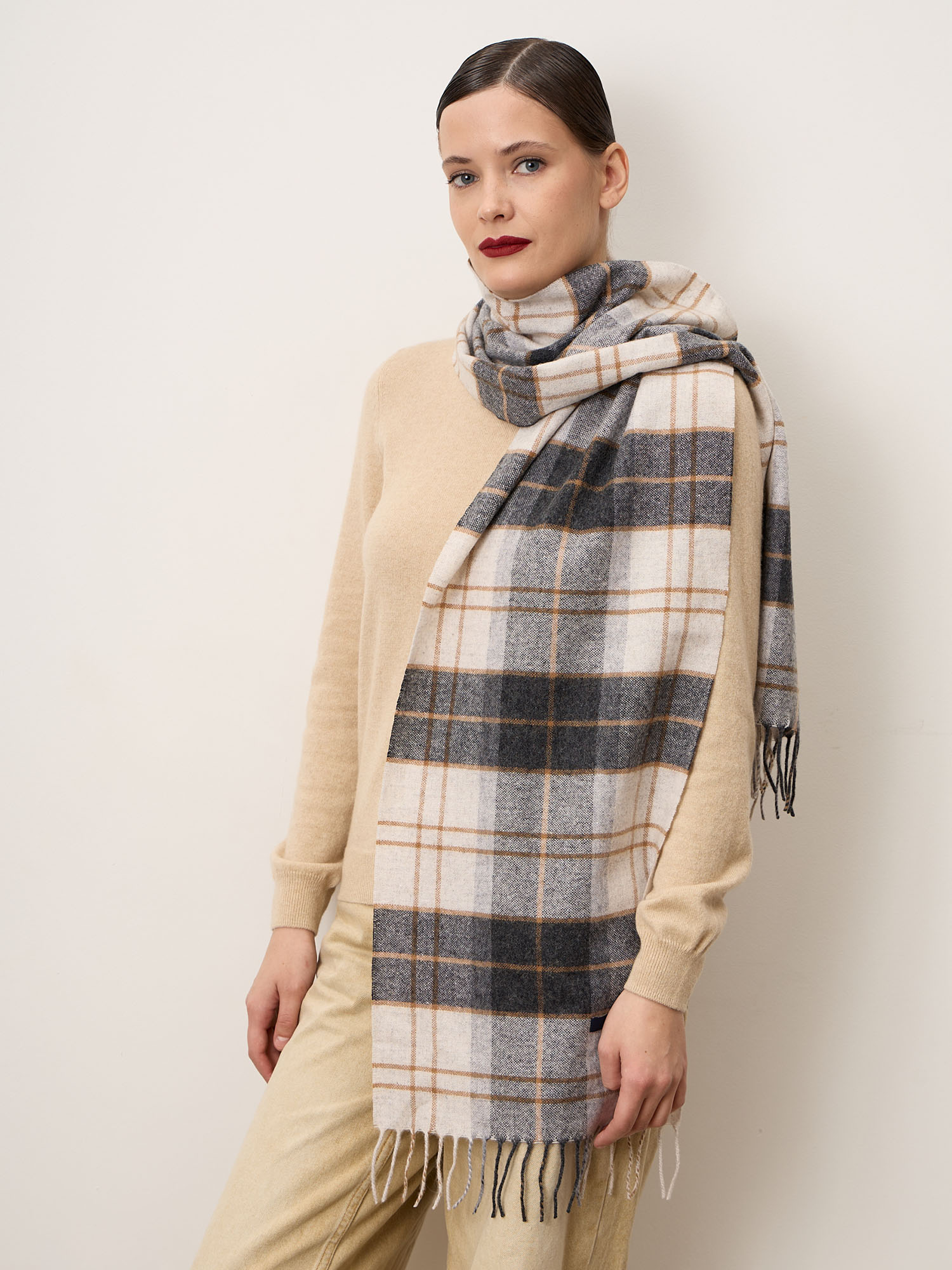 Классический прямоугольный формат позволяет носить шарф различными способами. Традиционный клетчатый узор придаёт изделию стильный характер, а аккуратная бахрома по краям добавляет лёгкий декоративный акцент. Модель легко сочетается с верхней одеждой и трикотажем.