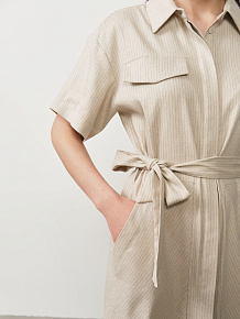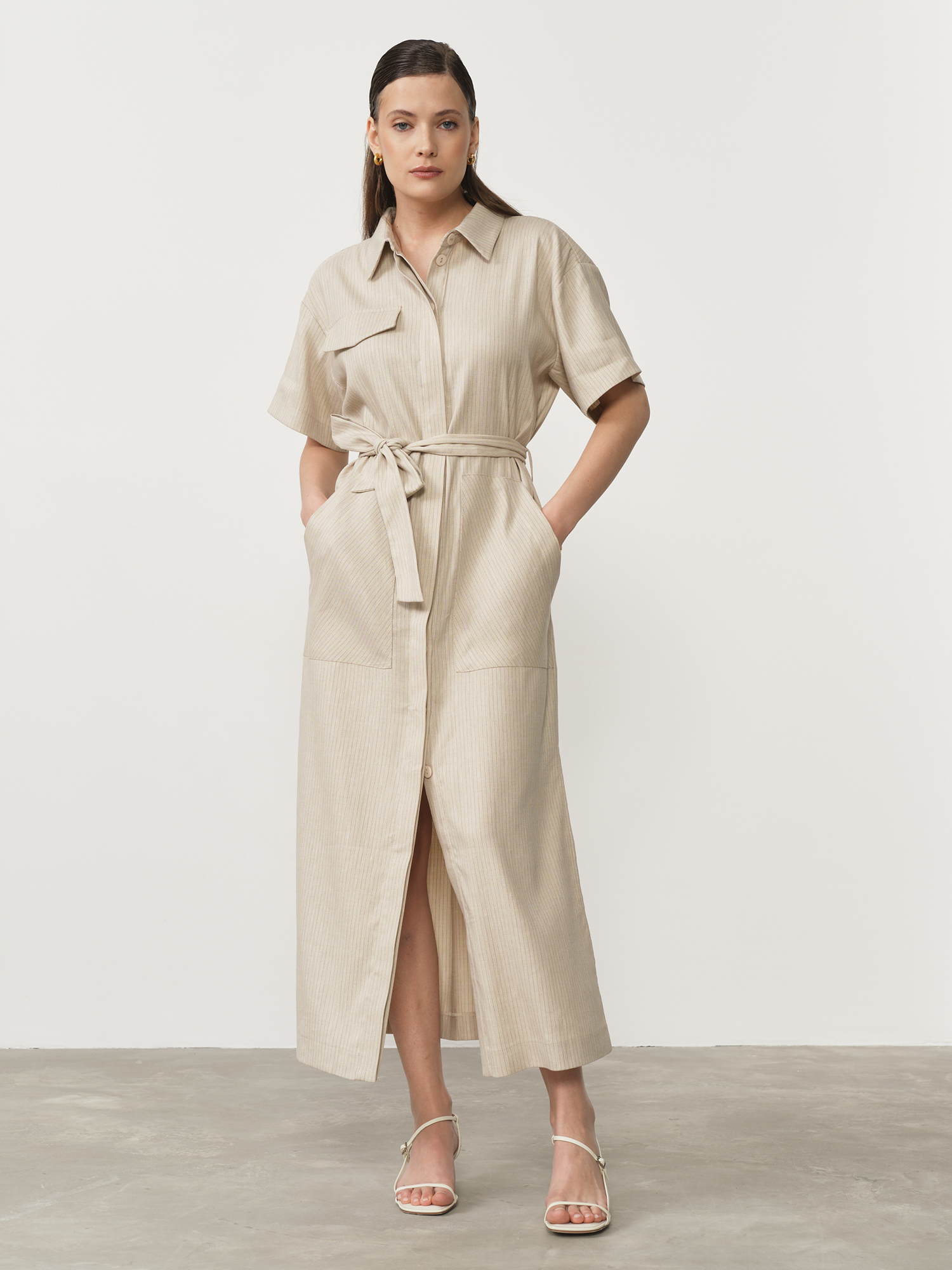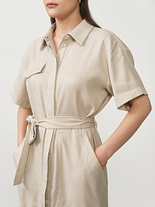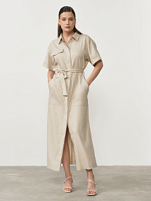 Лаконичный крой с чистыми линиями создает утонченный и женственный силуэт, который элегантно подчеркивает достоинства фигуры. Платье имеет продуманные пропорции и свободную посадку, обеспечивающую непринужденную элегантность и абсолютный комфорт при движении. Универсальный бежевый цвет делает это платье необычайно многогранным в плане сочетаемости – оно становится прекрасной основой как для ярких аксессуаров, так и для сдержанных дополнений в натуральных оттенках.