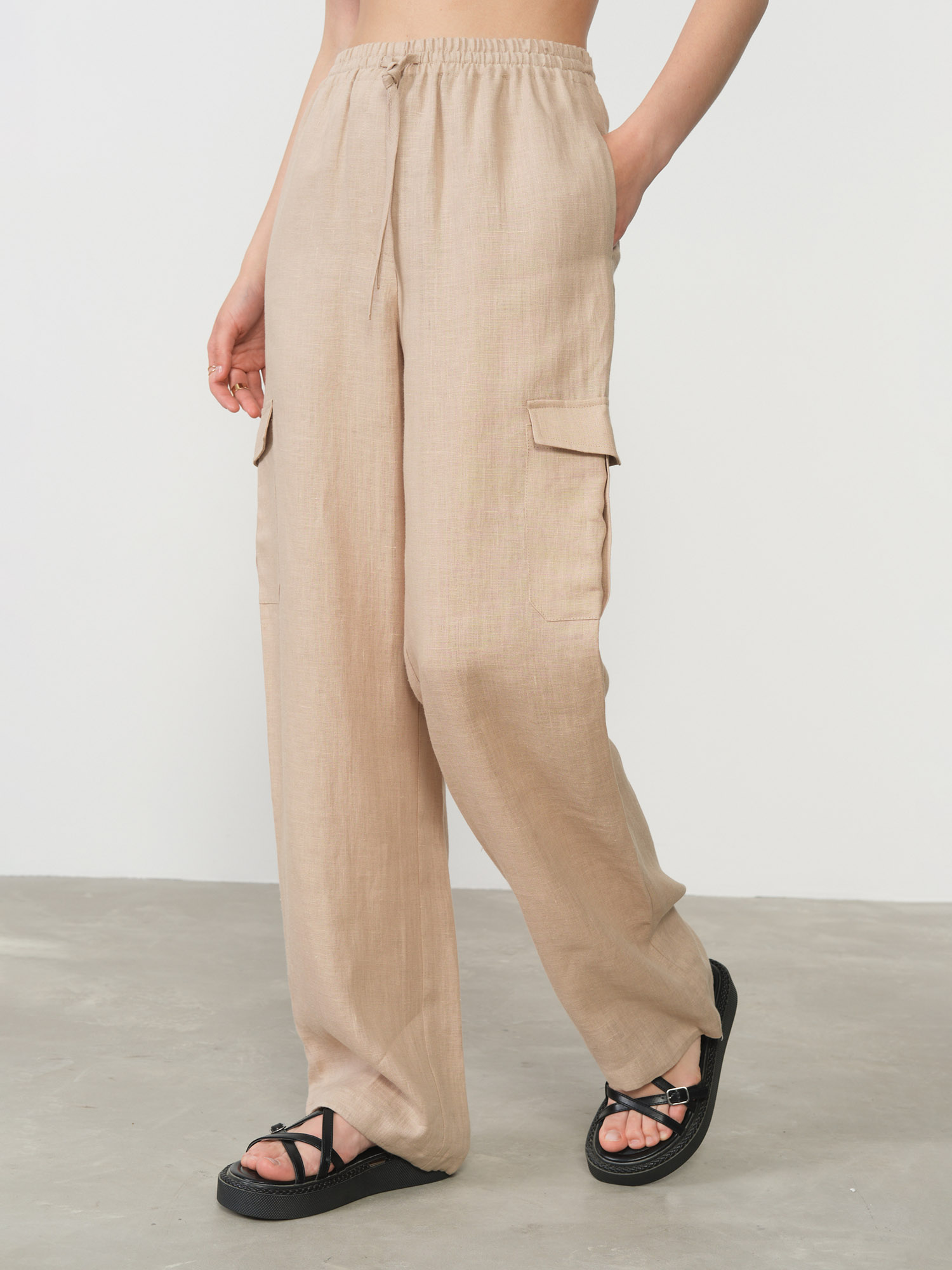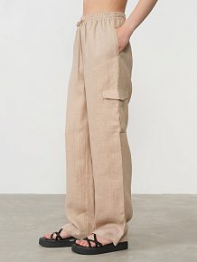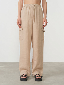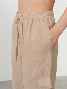 Модель отличается комфортным свободным кроем, который обеспечивает легкость движений и создает актуальный непринужденный силуэт. Эластичный пояс на резинке с регулируемыми завязками позволяет идеально подогнать посадку по фигуре, гарантируя удобство на протяжении всего дня. Функциональные карманы добавляют практичности этой стильной модели.