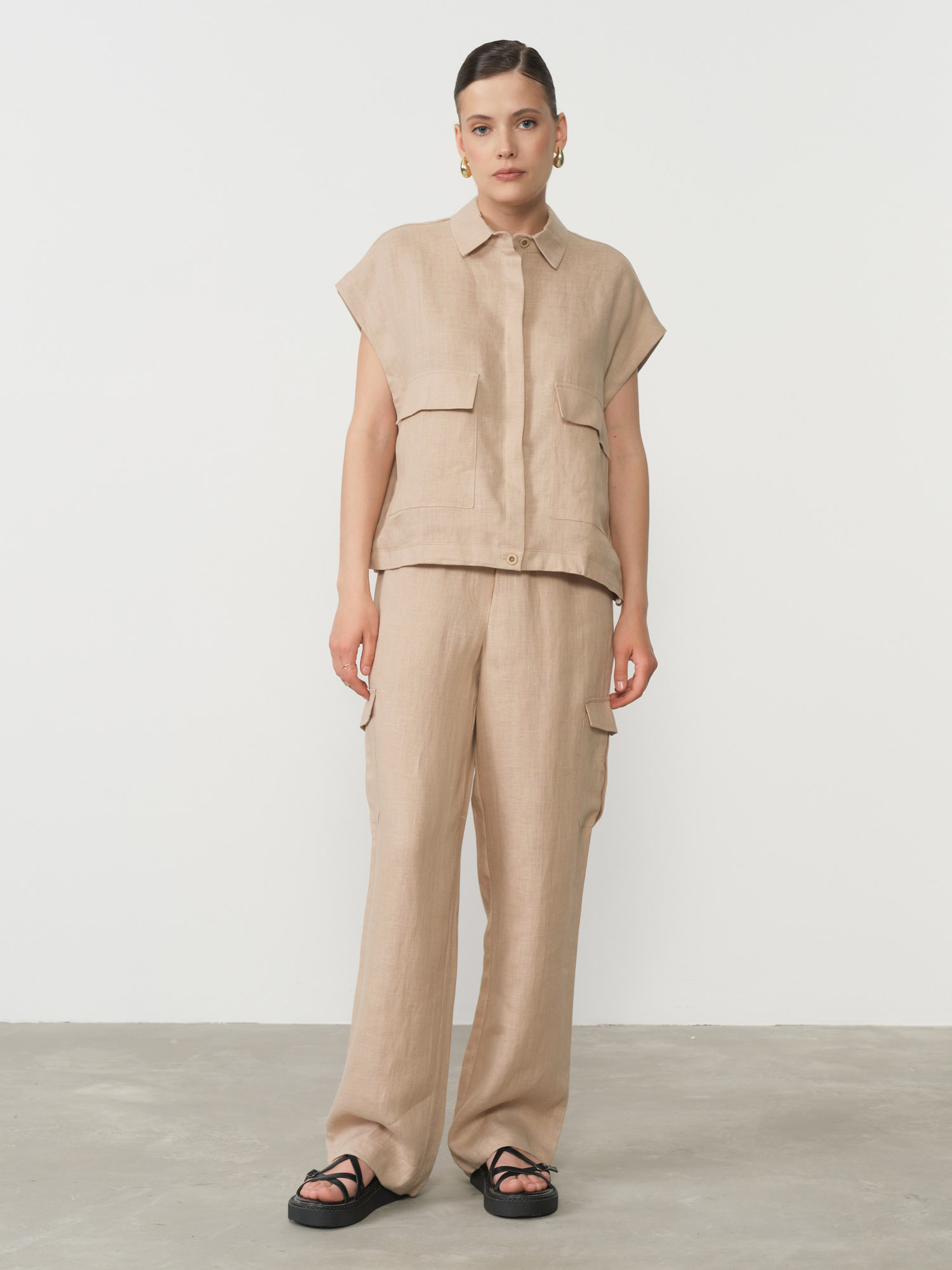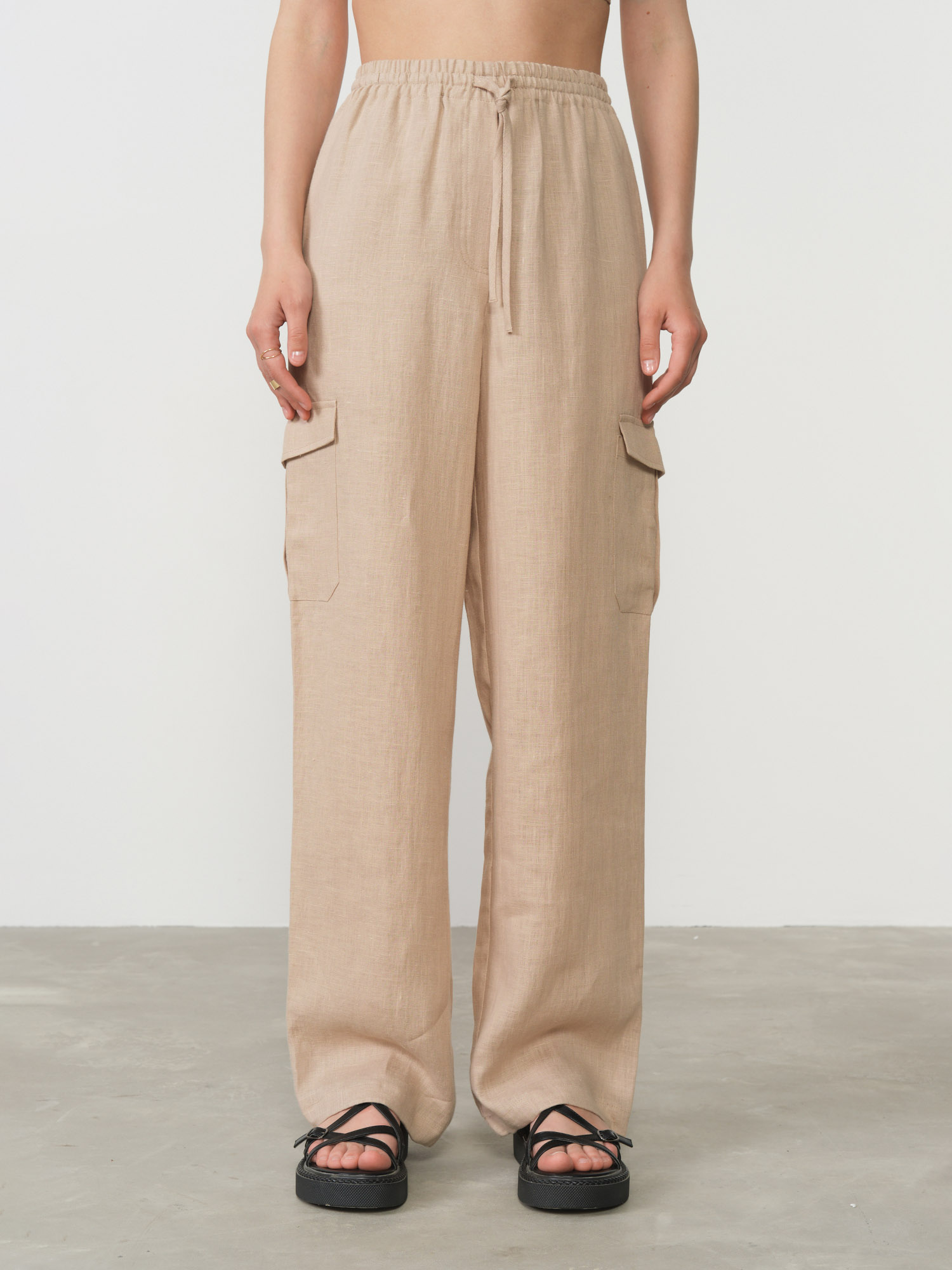 Универсальный серо-бежевый оттенок делает эти брюки исключительно многогранными в плане сочетаемости с другими элементами гардероба. Они одинаково гармонично смотрятся как с белыми блузами и футболками для создания классических летних образов, так и с яркими топами, если хочется добавить акцентных цветов в ансамбль.