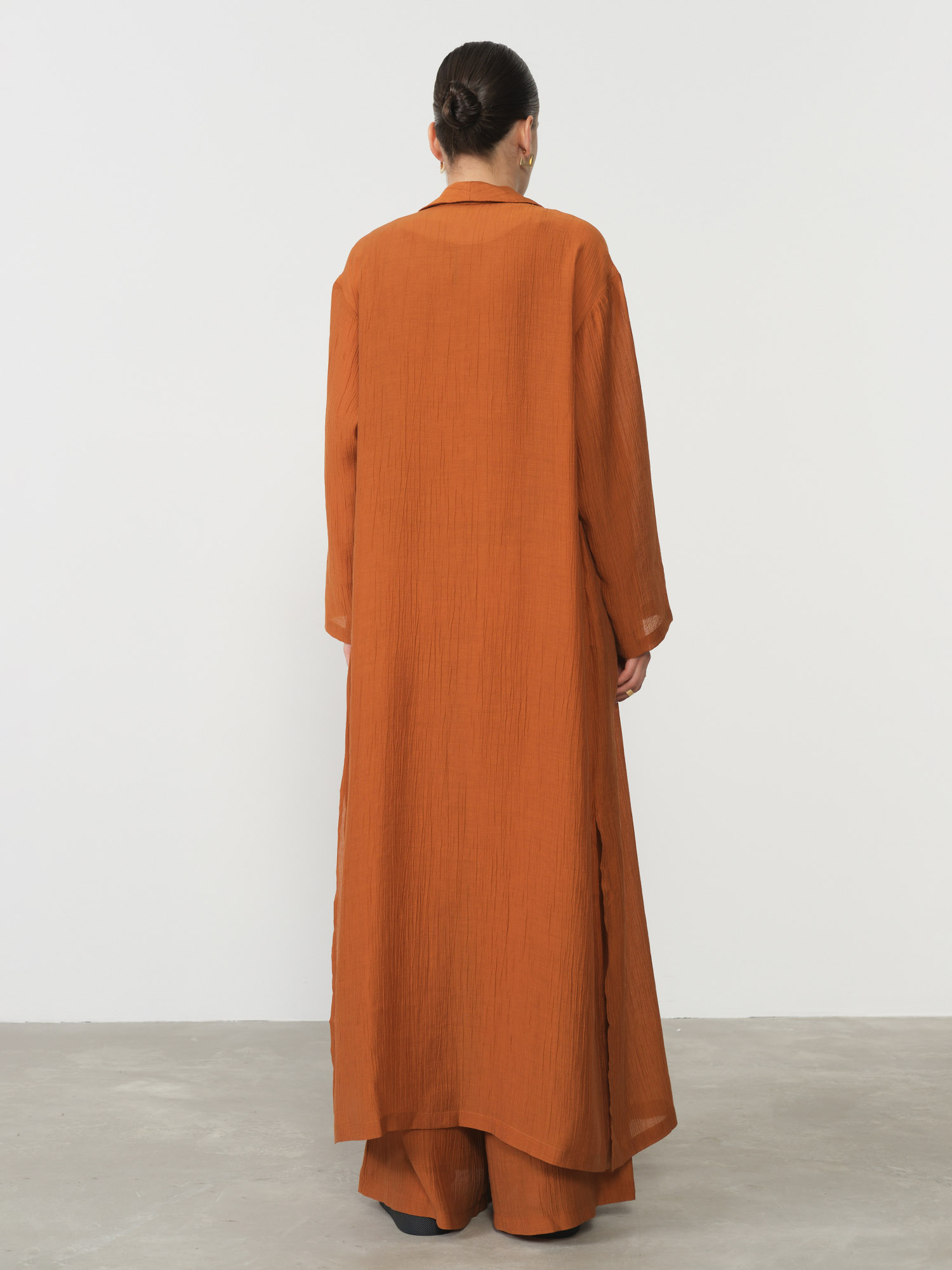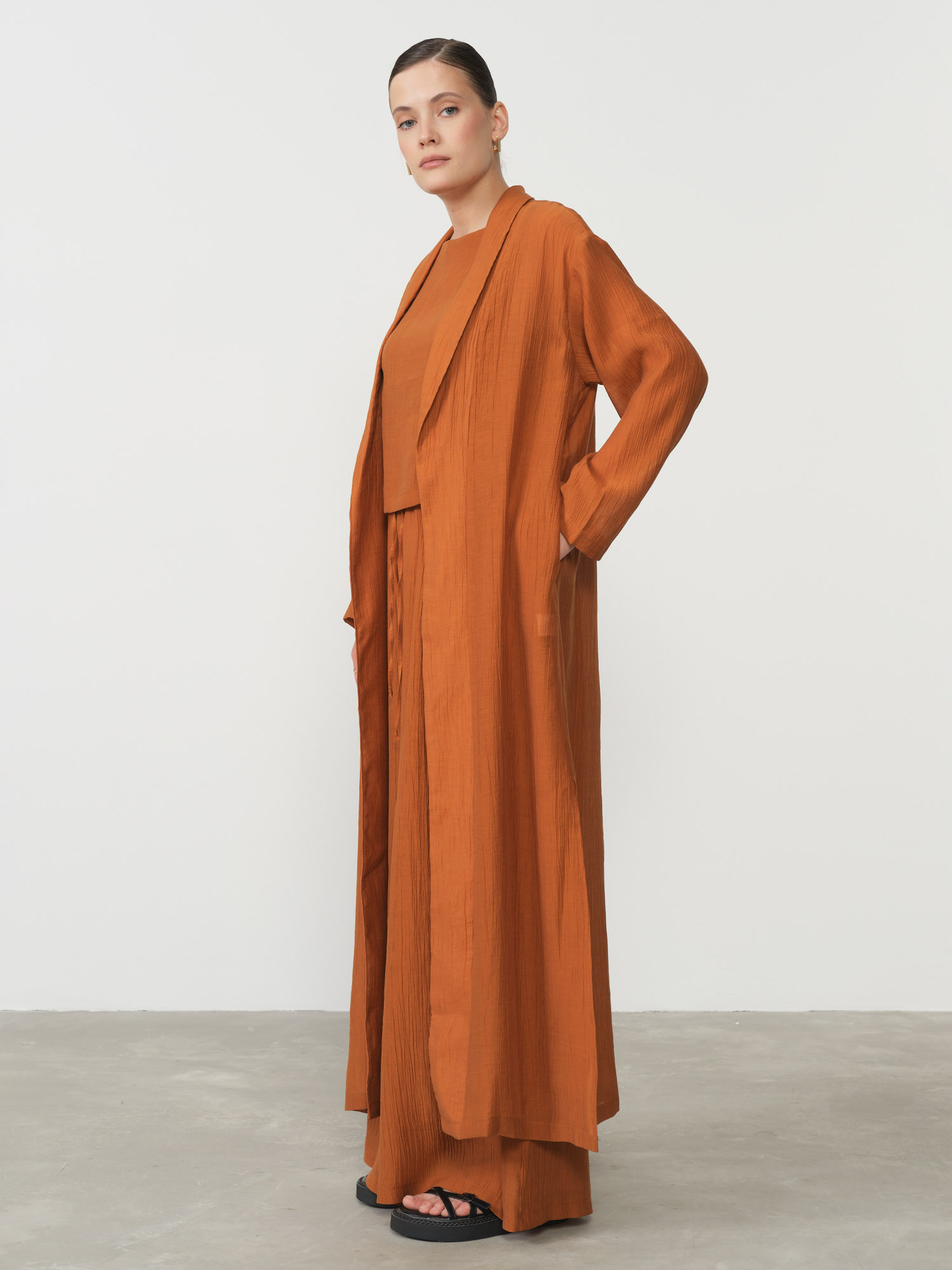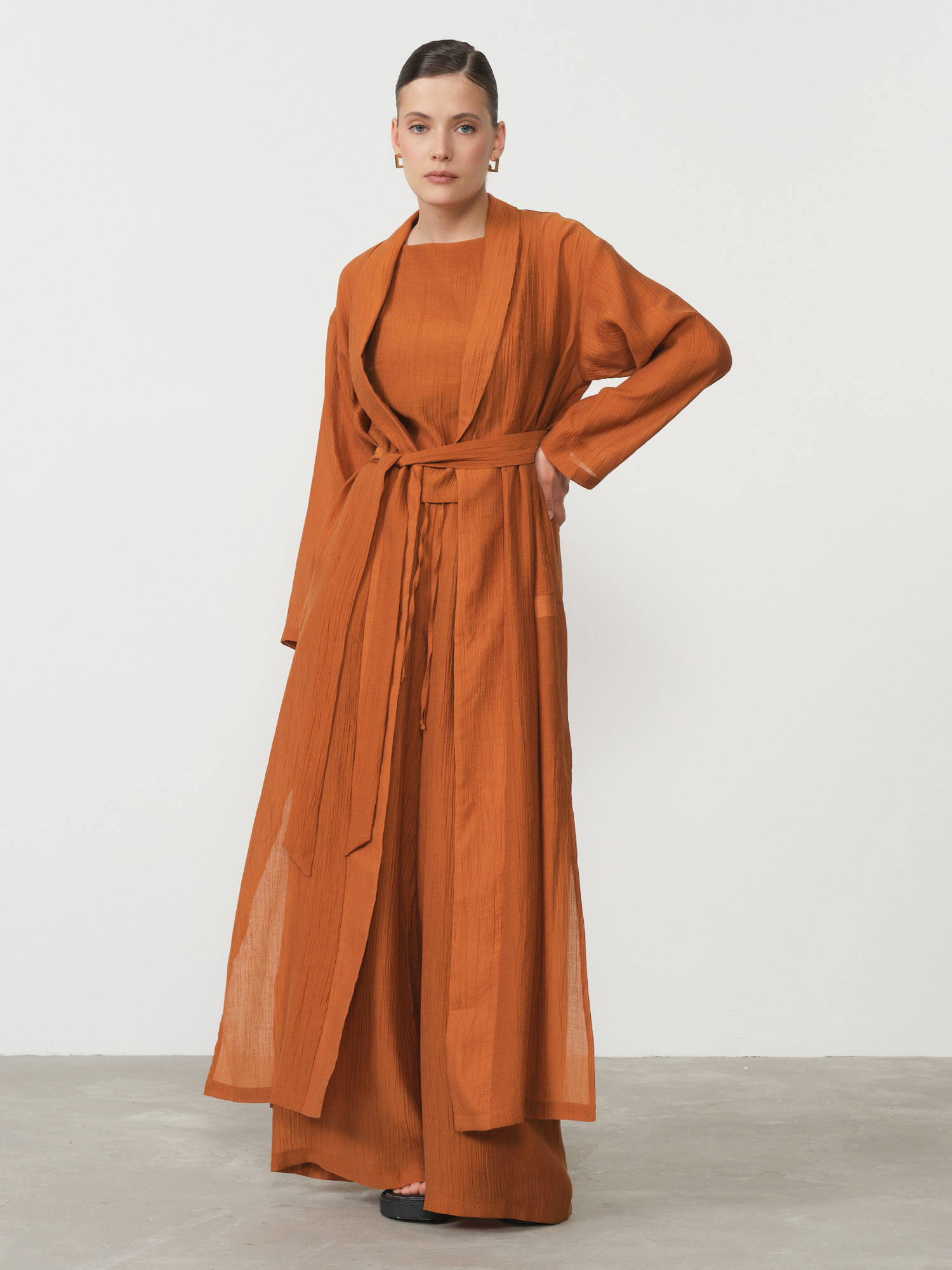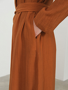 Свободный крой в стиле кимоно придает образу легкость и изысканность, а длинный фасон визуально вытягивает силуэт, добавляя элегантности любому комплекту. Глубокий терракотовый оттенок привносит в образ теплоту и благородство, великолепно сочетаясь как с нейтральными, так и с контрастными цветами. Широкий пояс подчеркивает талию, создавая женственный силуэт и позволяя варьировать посадку изделия.