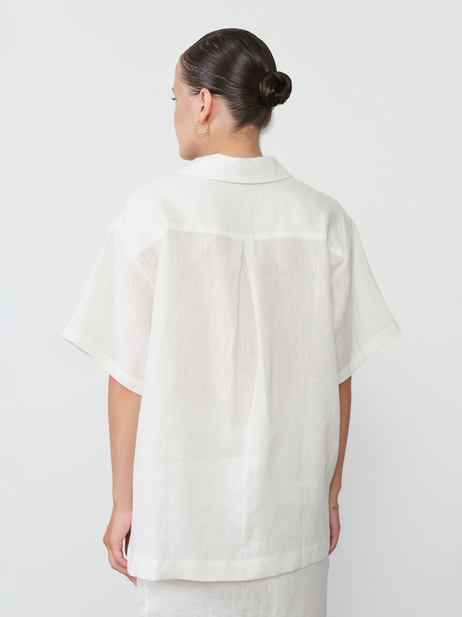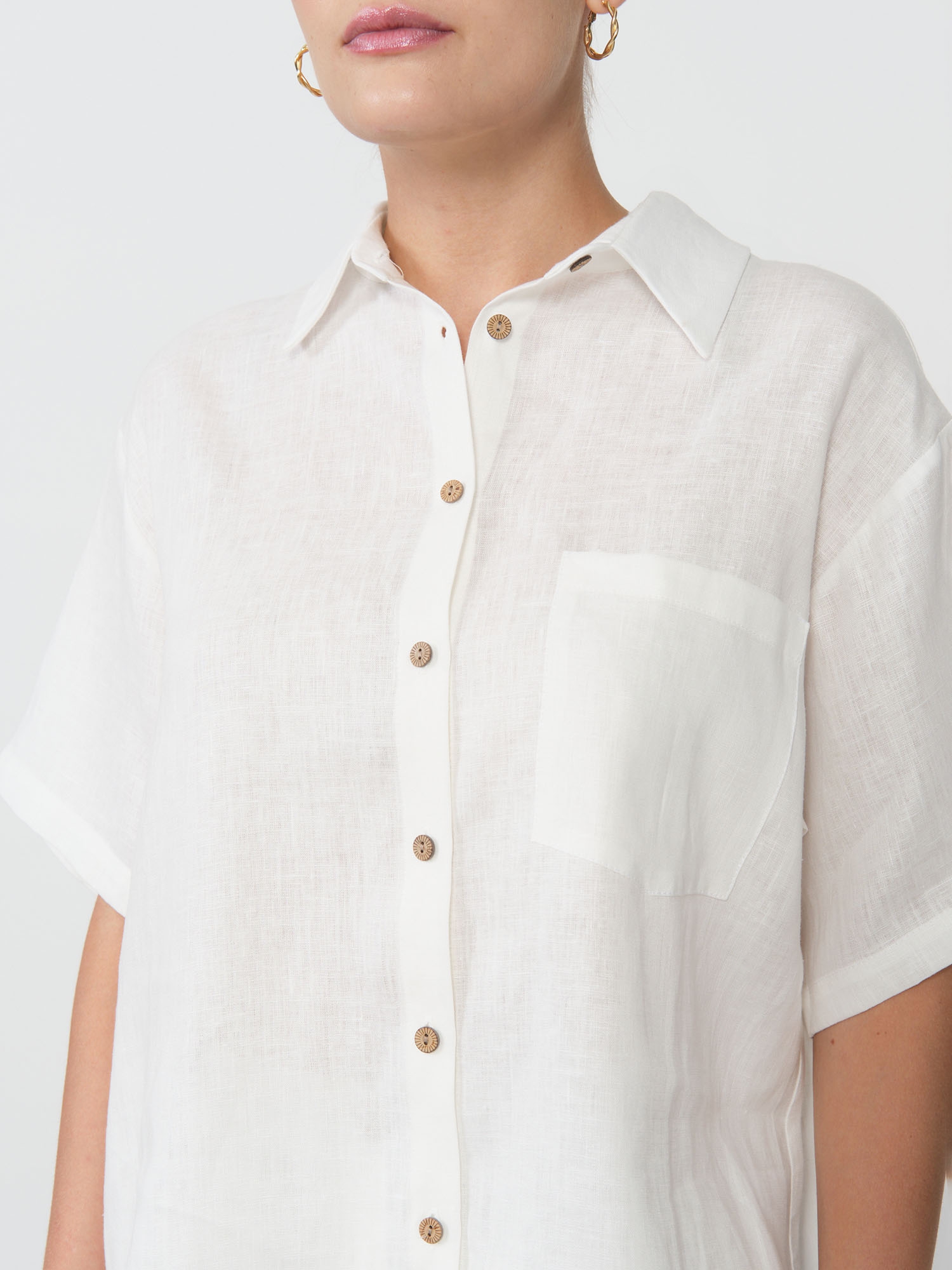 Классический свободный крой с отложным воротником и удлиненным силуэтом создает универсальный фасон, который подчеркивает женственность, сохраняя полную свободу движений. Эта рубашка одинаково хорошо сочетается с бежевыми льняными брюками для гармоничного ансамбля, с джинсами для городского стиля или с шортами для пляжного образа. Аккуратные детали в виде пуговиц из натуральных материалов и продуманный крой подчеркивают качество исполнения.