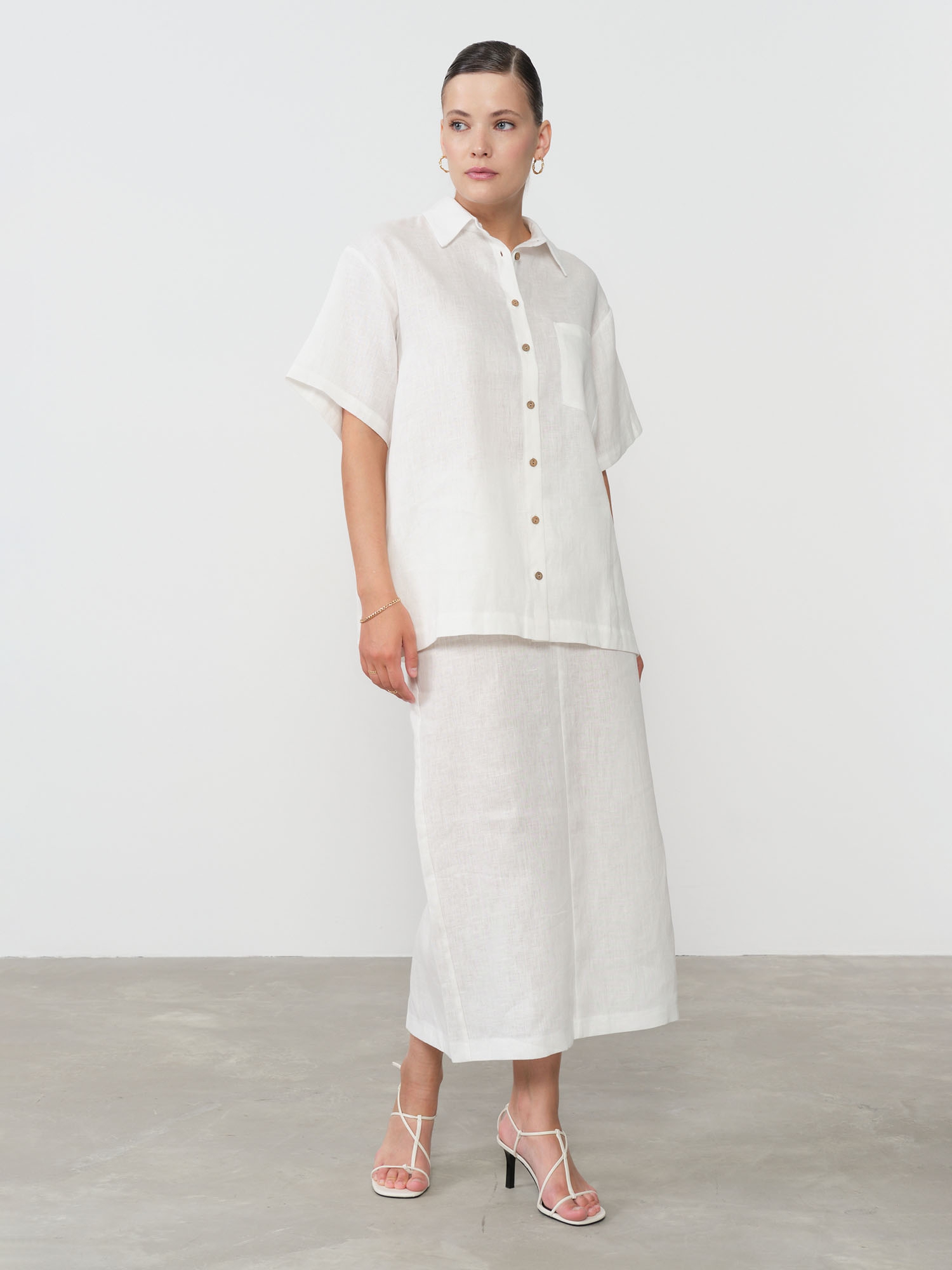 Натуральный лен — экологичный выбор для ценителей устойчивой моды. Этот материал с каждой стиркой становится мягче, сохраняя при этом форму и благородный оттенок. Выберите эту льняную рубашку — пусть ее нежный цвет и природная свежесть станут источником вдохновения для ваших летних образов.