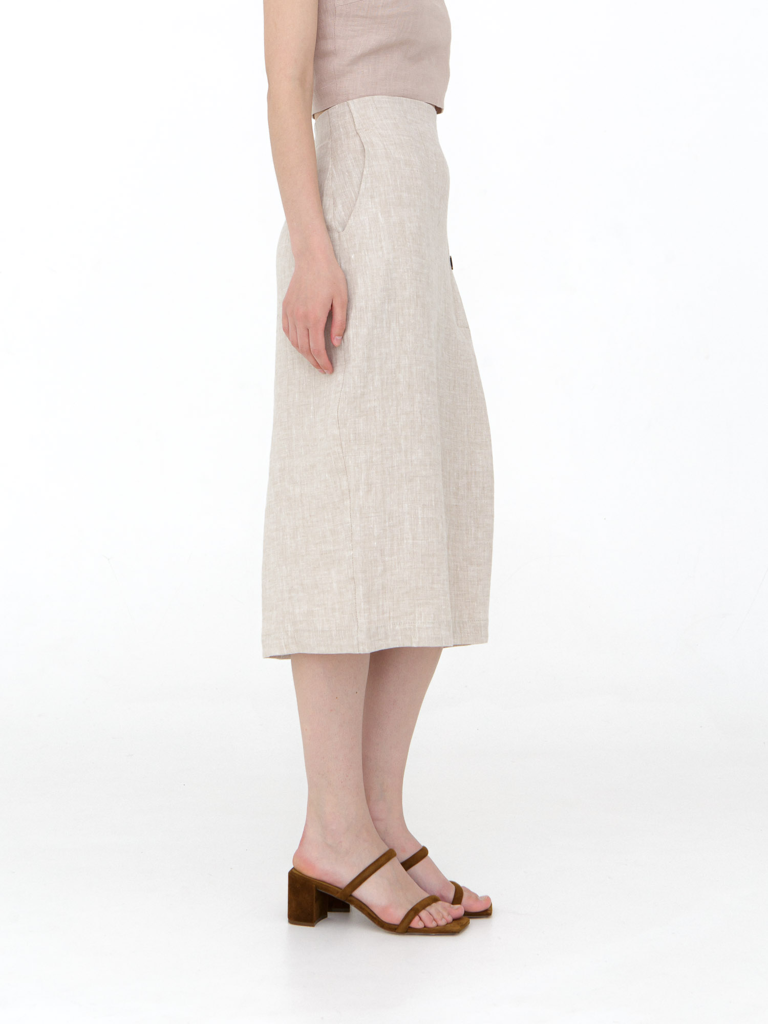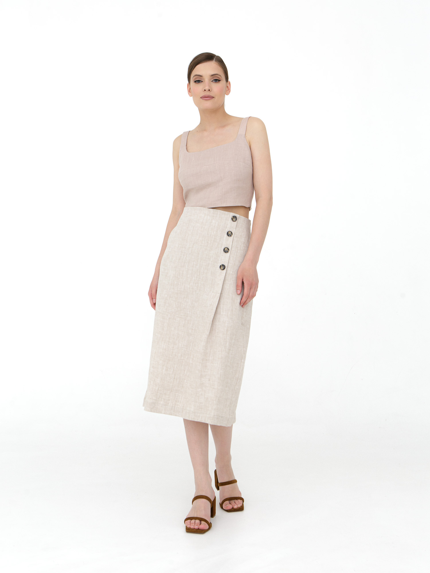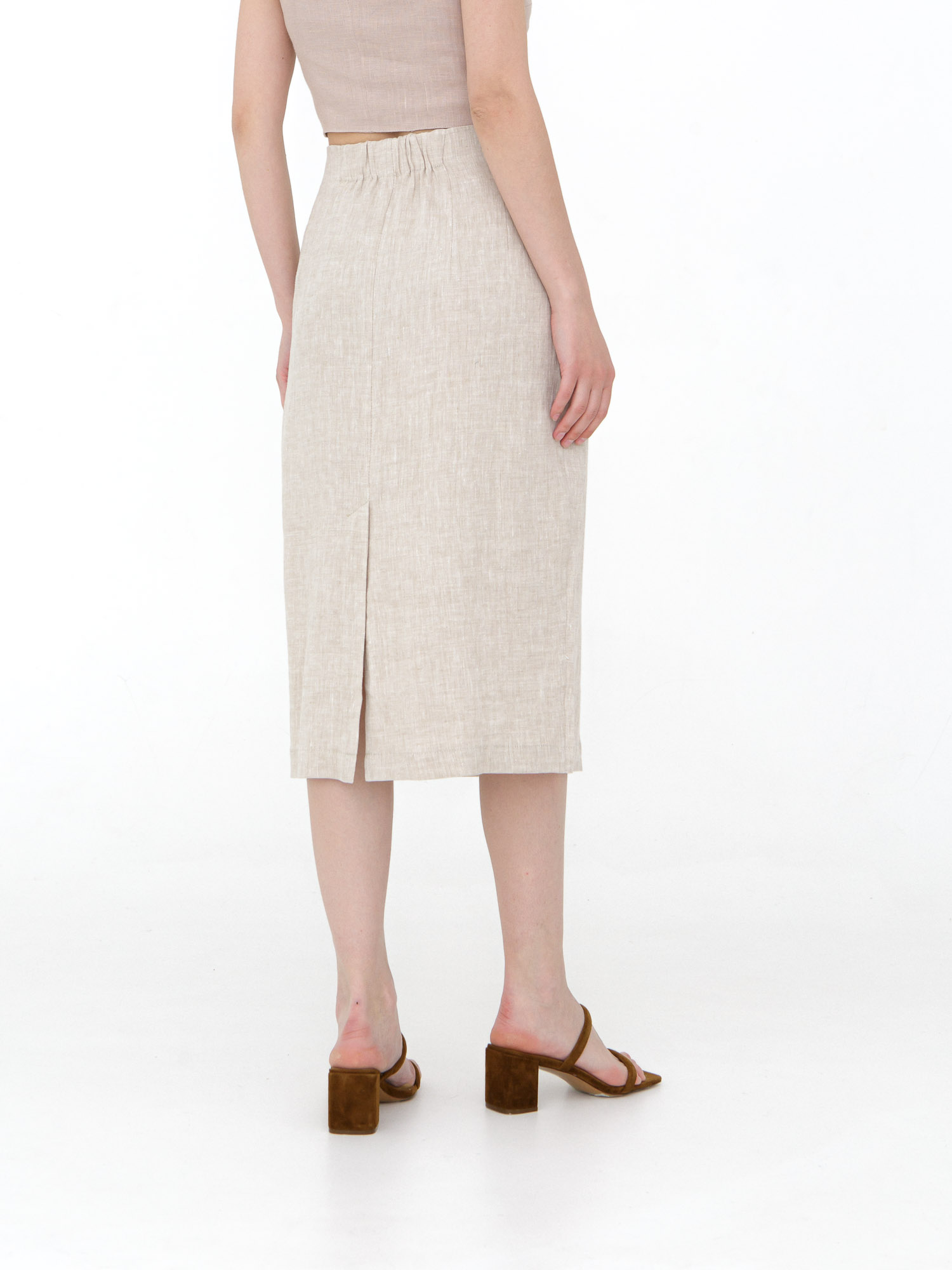 Эта льняная юбка станет основой для создания разнообразных образов: комбинируйте её с топами и блузами для повседневных выходов, с элегантными рубашками для деловых встреч, или с кроп-топами для отдыха у моря. Она одинаково хорошо смотрится с сандалиями, кедами или элегантными босоножками на каблуке.