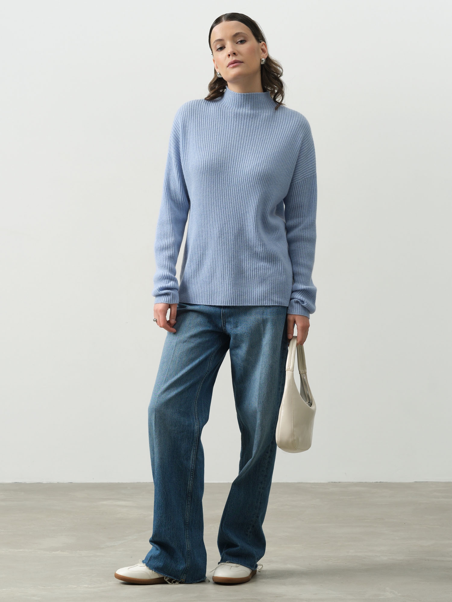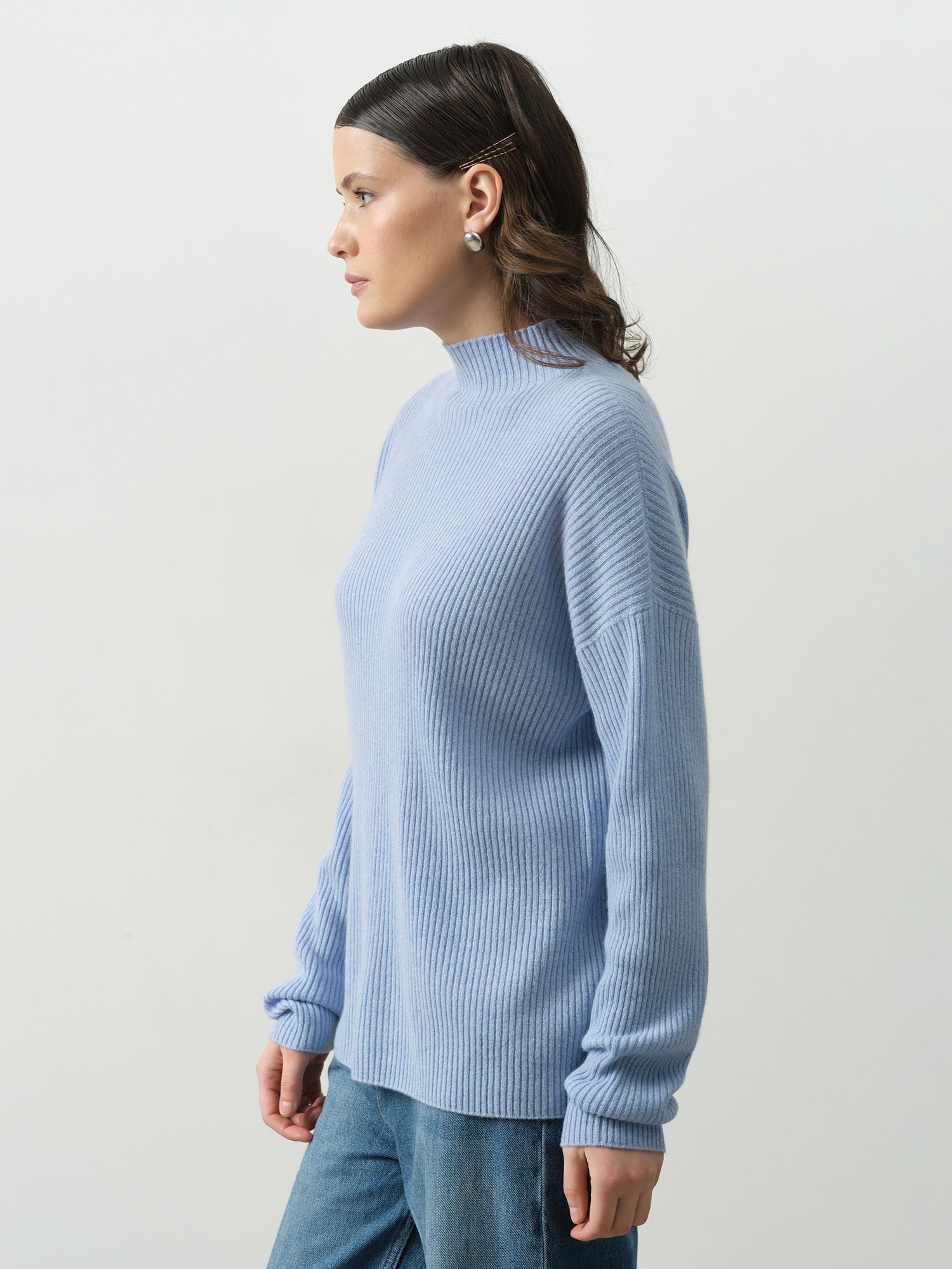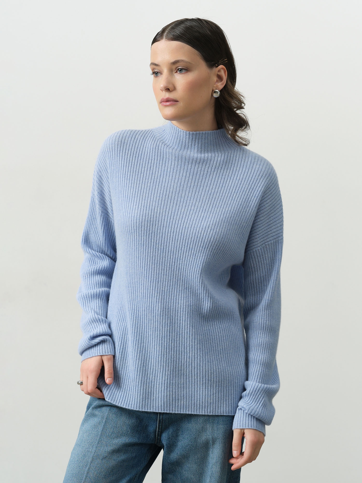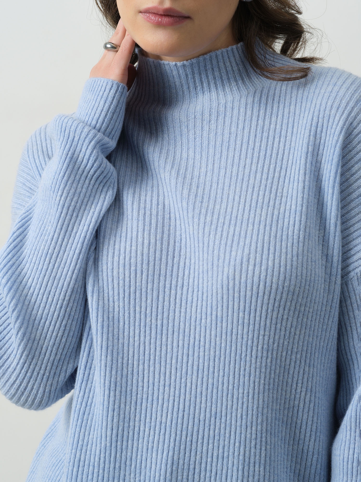 Лаконичный крой с классической линией плеча и круглым вырезом горловины делает джемпер универсальным. Он элегантно подчеркивает силуэт, не стесняя движений. Небесно-голубой оттенок освежает лицо, делает кожу сияющей и гармонирует с множеством цветов – от нейтральных до акцентных.