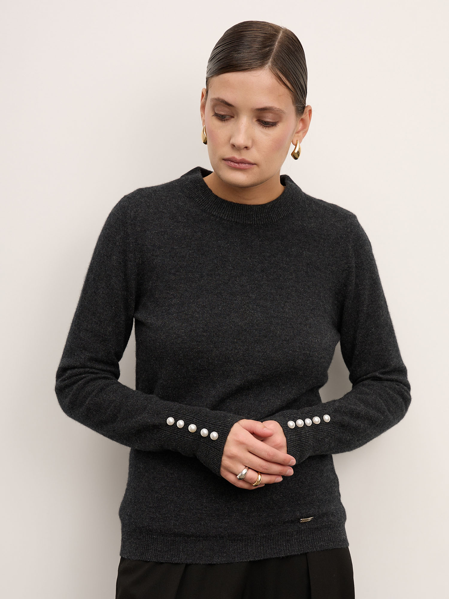 Джемпер выполнен в минималистичном крое с округлым вырезом и длинными рукавами. Акцент — изысканные декоративные пуговицы на манжетах, которые добавляют образу изящность и индивидуальность. Манжеты и нижняя резинка держат форму и подчёркивают аккуратную посадку изделия.