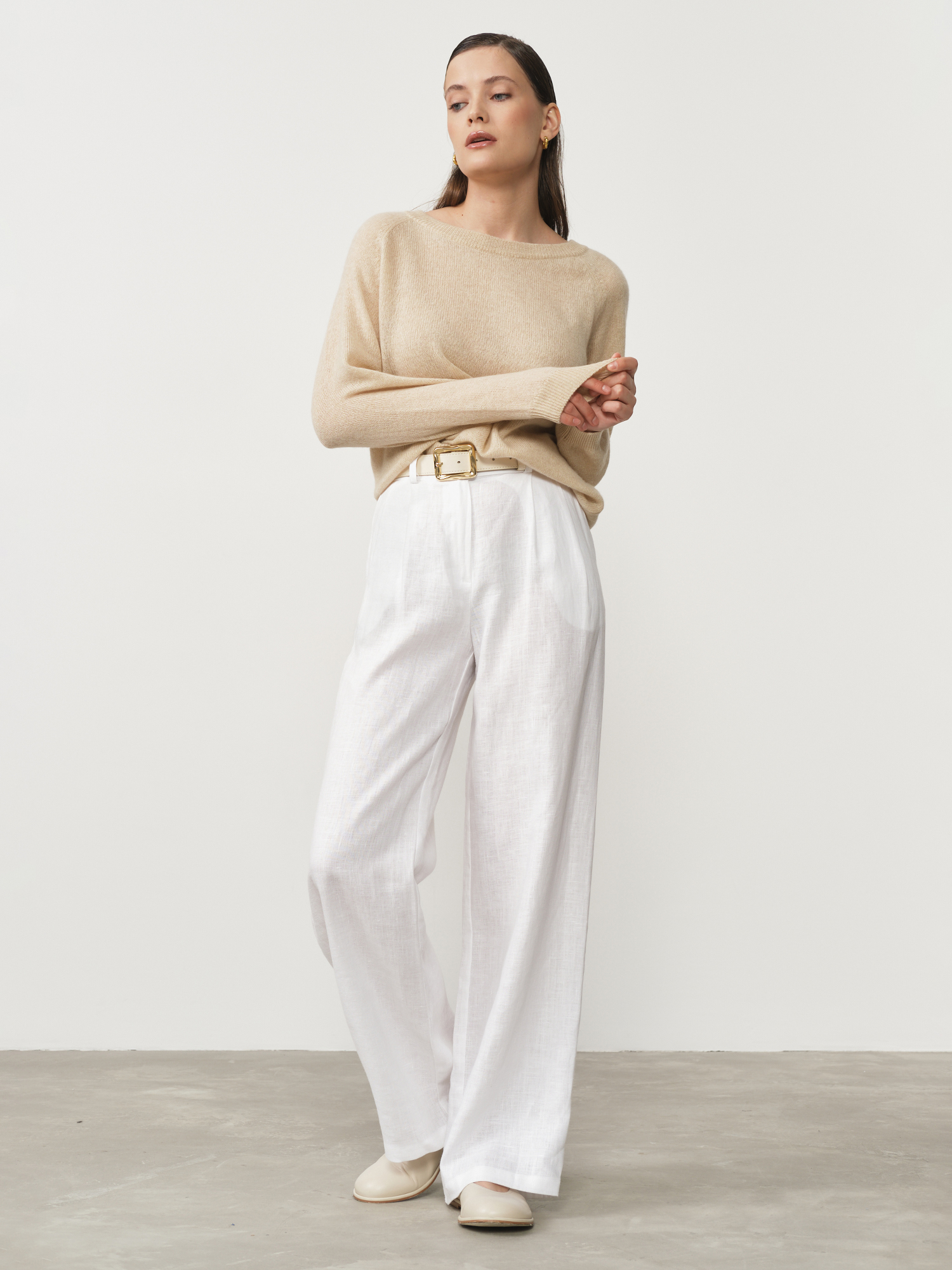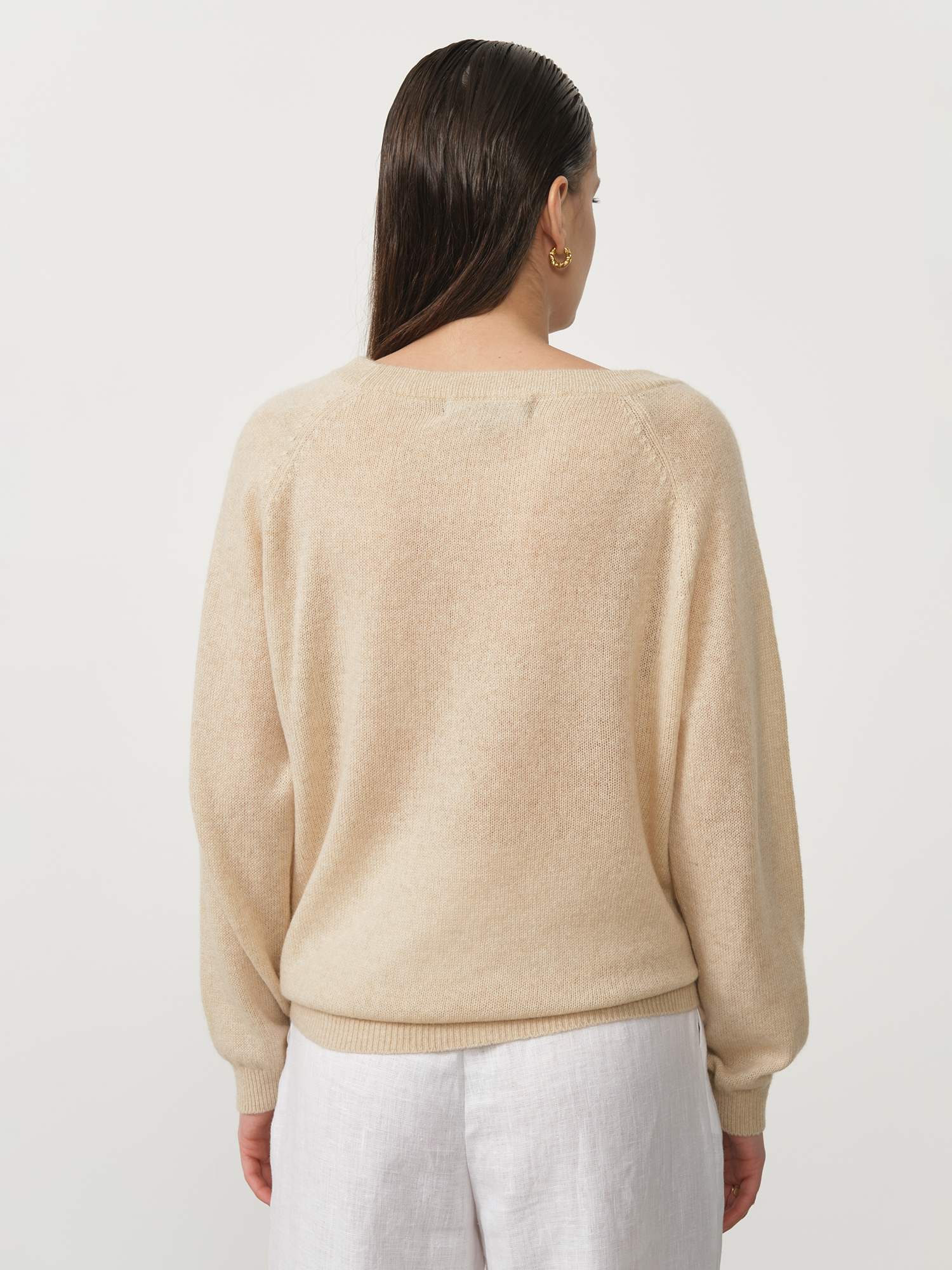 Классический крой с круглой горловиной обеспечивает идеальную посадку по фигуре, не стесняя движений. Безупречная, равномерная вязка создает эффект шелковистой гладкости и подчеркивает премиальный характер изделия. Бежевый оттенок — воплощение тонкого вкуса и элегантности, легко интегрируется в любой гардероб и стилистические направления.