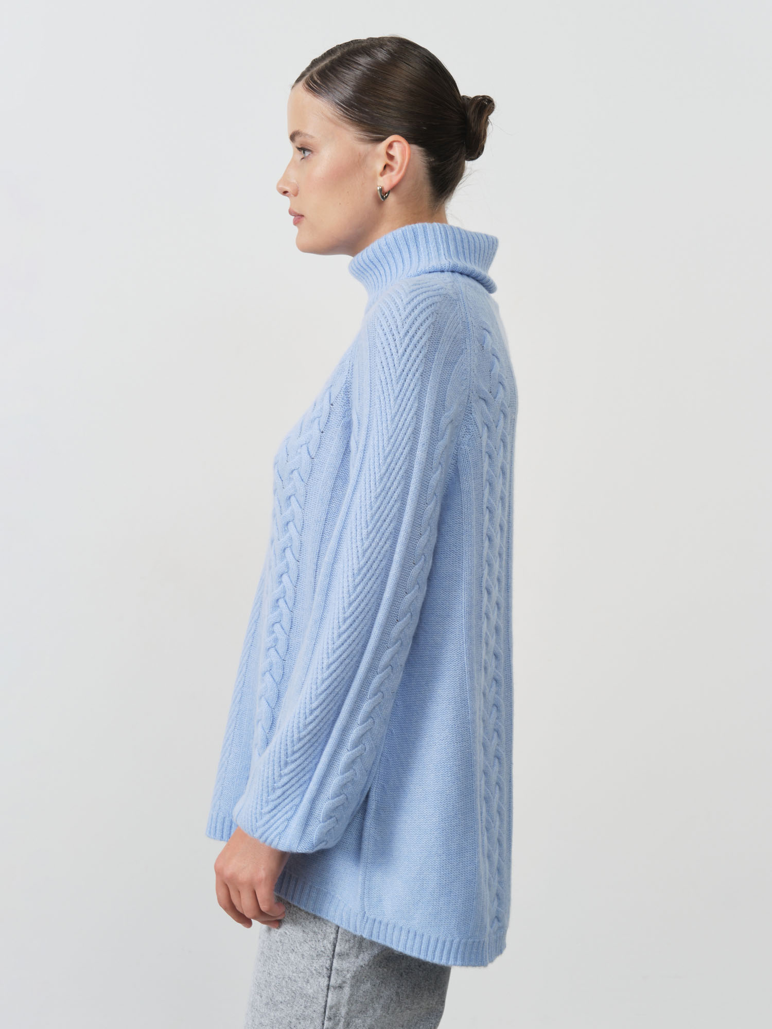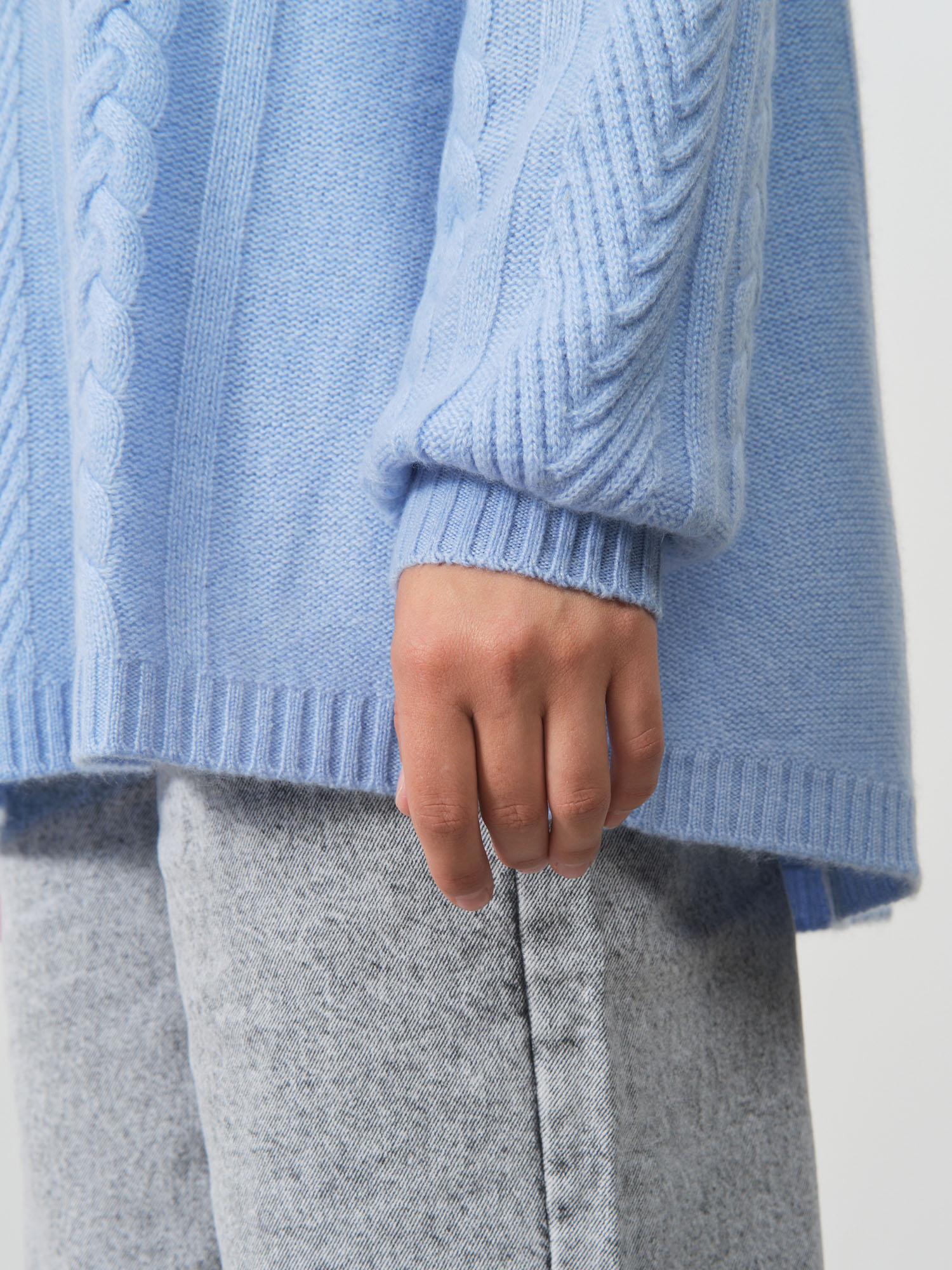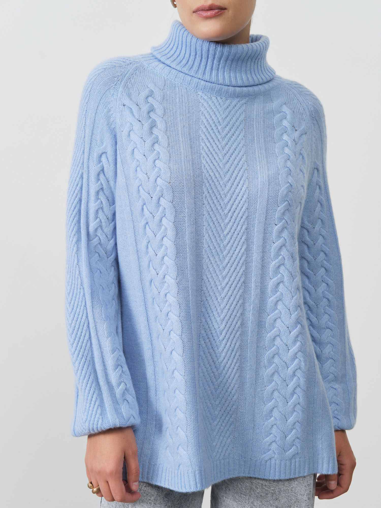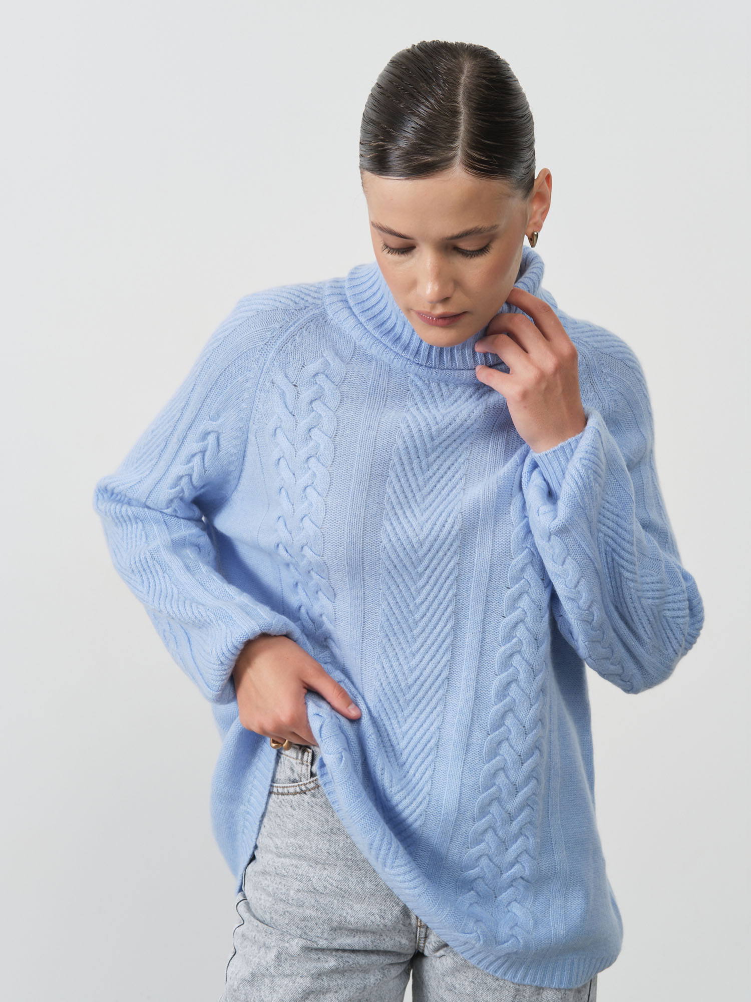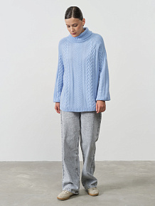 Голубой цвет придает образу нежность и свежесть, визуально омолаживает и гармонично дополняет любой цветотип внешности. Благодаря классическому дизайну и универсальному оттенку, свитер легко комбинируется с разнообразными элементами гардероба — от элегантных брюк до джинсов или юбок различной длины.