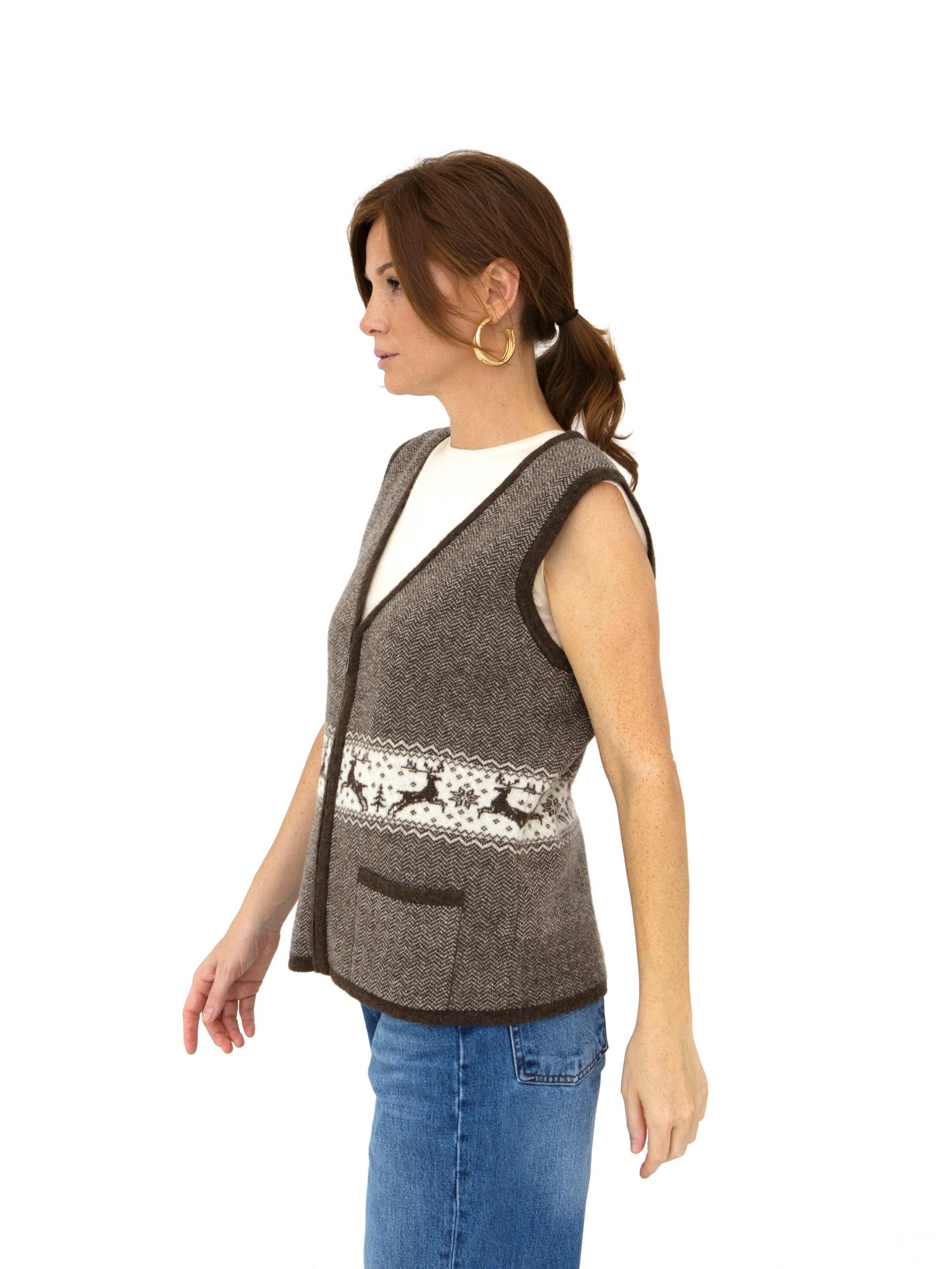 Женский жилет из 100% натуральной шерсти с рисунком коричневого цвета – практичное и стильное дополнение вашего гардероба. Изготовленный из высококачественной шерсти, этот жилет отличается превосходными теплоизоляционными свойствами. Природная структура шерстяных волокон обеспечивает отличную воздухопроницаемость и регуляцию температуры – в нем тепло в холод и комфортно в помещении.